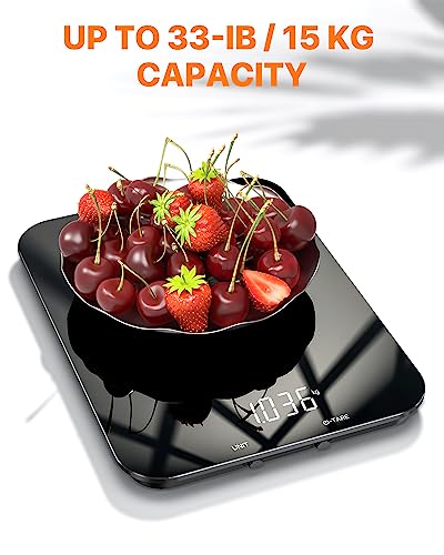 【33 LB & USB Rechargeable】Digital Kitchen Food Scale Kitchen Scale, Glass Digital Weight Grams and Oz, Baking and Cooking, 0.05oz Precise, 5 Weight Units (Black)