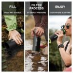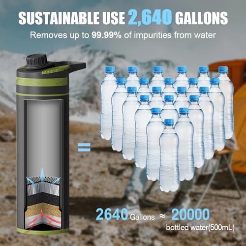 our filter water bottle has a filter pore size of 0.01 μm, which can remove most harmful pollutants. The natural coconut activated carbon filter medium is used to effectively reduce chlorine and remove heavy metals, helping you get the purest water.fill. Press. Drink. “Fill” filter bottles from any cloudy fresh water source, place them on the ground to “press”, and then “drink” clean water anywhere in the world.Carry this 26.3 oz portable filter water bottle with you to say goodbye to frequent store visits and the hassle of carrying single-use plastic bottles. The replaceable purifier filter element is rated at 2640oz (about 1 year) to help you reduce the use of 20,000 single-use plastic bottles.