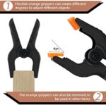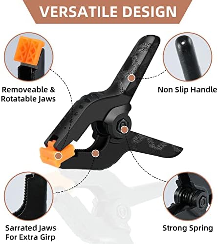 Excellent Design:The pads in the heads of heavy duty clips are designed to be soft and flexible to protect finishes and provide maximum flexibility and tension.The flexible orange pads of the small clamps for crafts can rotate different degrees to adjust different objects,can be removed.The plastic clamps have high strength spring whose force is about 3.5lbf clamps heavy duty.
