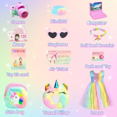 1* Sets of doll clothes for 18 inch doll1* Doll luggage, 1* Doll bag1* Travel pillow, 1* Pink sunglasses1* Doll bead bracelet, 1* Camera toy 1* Computer toy and other cute doll accessories