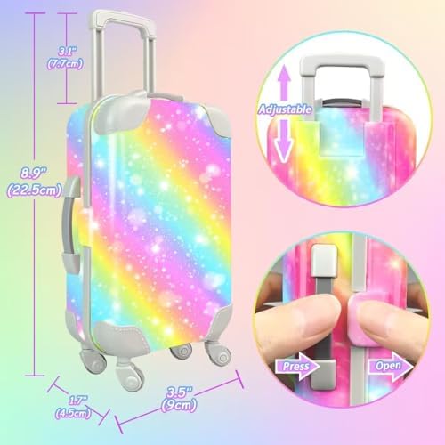 🌈Portable Travel Luggage- The doll case comes with 4 rotating wheels and an adjustable handle that makes it easy to move up and down, open and close, just like the real thing. The case measures 3.5×1.7×8.9 inches and most doll accessories can be easily stored inside the doll case.