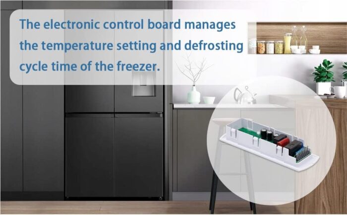 Electronic control board 297370600 manages the functions of the freezer such as the temperature settings and defrost cycle time.