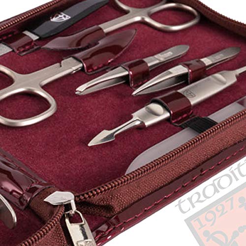 CASE: Synthetic leather burgundy, size ca. 17,0 x 14,0 x 3,0 cm. Our organizers are made of high-grade fashion or classic materials. Additional equipment: Microfiber cleaning cloth for cleaning steel items, general info sheet “Finger – Nail Grooming”.