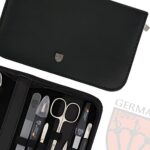 CASE: Genuine leather black, size ca. 18,0 x 11,0 x 2,0 cm. Our organizers are made of high-grade fashion or classic materials. Additional equipment: Microfiber cleaning cloth for cleaning steel items, general info sheet “Finger – Nail Grooming”.