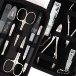 Cuticle scissors, nail scissors, nail clipper, toe nail clipper, cuticle remover, tweezers, nail cleaner, sapphire nail file (fine and coarse coating), nail nipper, cuticle nipper, glass nail file (double sided).