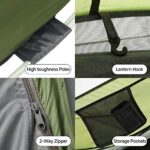 Spacious Interior: 9.5 x 6.6 feet floor;Sleeps up to 4 people in sleeping bag or 2-3 people with lots of camping gears; Center Height: 52″.