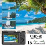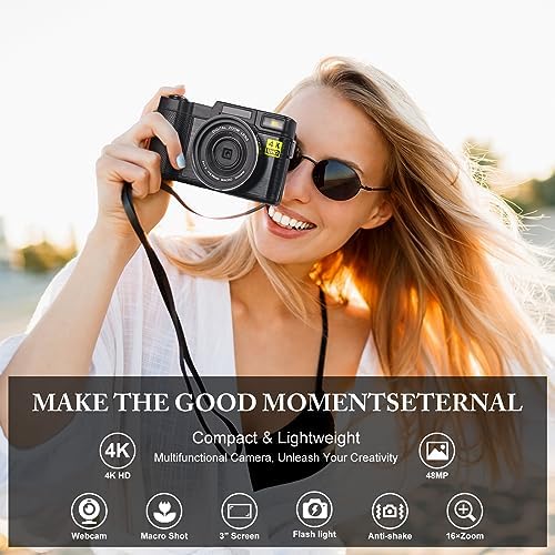Home Electronics Camera 4K Digital Camera for Photography, Autofocus 48MP Vlogging Camera for YouTube with 16X Digital Zoom Macro Camera, 3’’180°Flip Screen Compact Video Camera with Liftable Flash, SD Card&2 Batteries