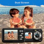 📷【Dual Screens & Selfie Mode】 The waterproof digital camera is featured with 2.8 inch(640*480) and 1.7 inch(240*280) IPS dual screen, swapping to the front facing display to take selfies and get the same quality photo regardless of which screen you use. The unique feature of having a second screen for selfie mode makes it a very convenient travel camera.