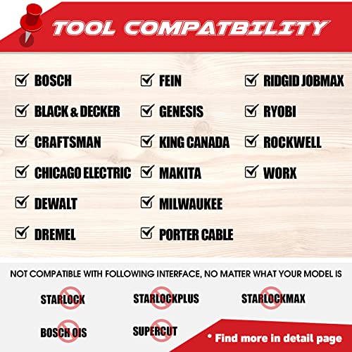【Wide Compatibility】Fit more than 95% brand oscillating tool in the market, such as BOSCH, Black & Decker, Craftsman, Chicago Electric, Dewalt, Fein, Genesis, King Canada, Makita, Milwaukee, Porter Cable, Ridgid Jobmax, Ryobi, Rockwell, Worx, etc. ⚠⚠⚠ Some of models will not fit, please CHECK the detail pages to make sure your model is available ⚠⚠⚠