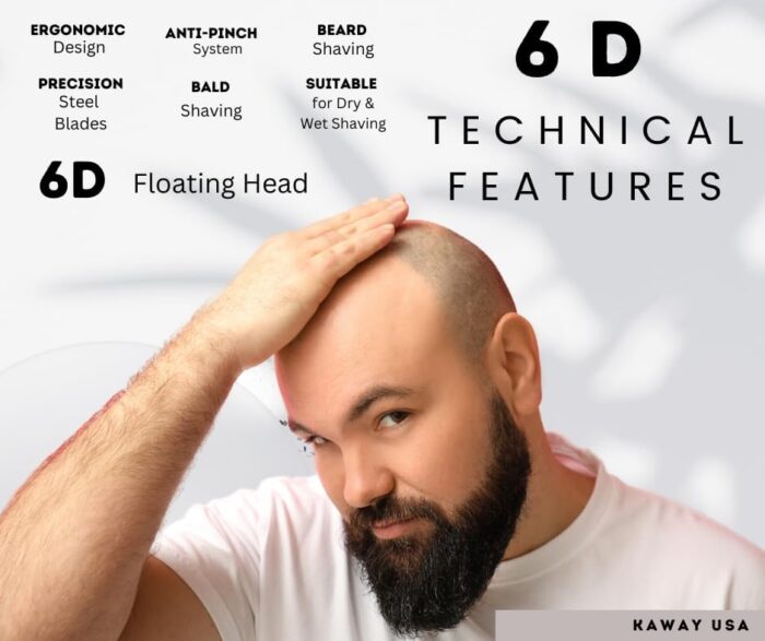 6D Shaver: Our 6D Shaver for Men is the perfect choice for men seeking a versatile grooming solution. Effortlessly switch between precision bald shaving and precise beard grooming with its innovative design. Enjoy the convenience of dry and wet shaving while the Anti-Pinch System ensures a comfortable experience. Its ergonomic design fits perfectly in your hand, making it the ideal electric shaver for men, especially head shavers for bald men. Upgrade your grooming routine today!