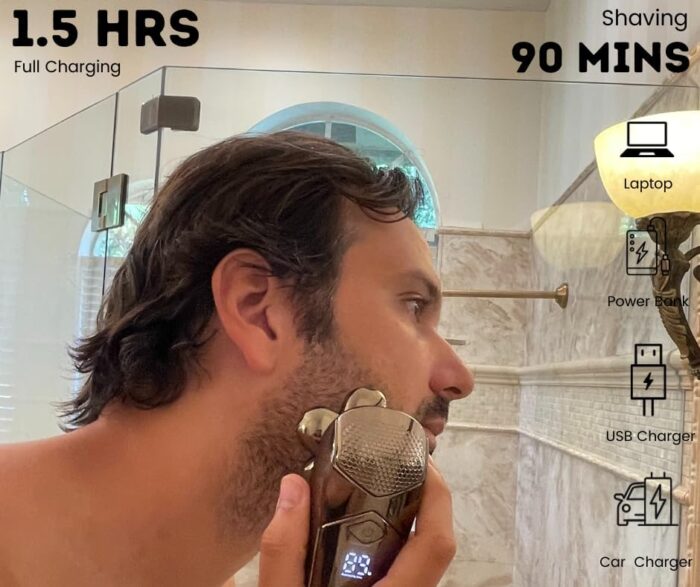 6D Shaver: Experience ultimate versatility with our 6D Shaver – the all-in-one solution for men’s grooming needs. This electric shaver for men offers a multifunctional 5-in-1 design, featuring a Precision Trimmer, Nose Trimmer, Cleaning Brush, Hair Trimmer and Massage Brush. Whether you need a clean shave, a precise trim, or a relaxing massage, this shaver has you covered. With an impressive 1.5 hours of use at full load, it’s ready whenever you are.