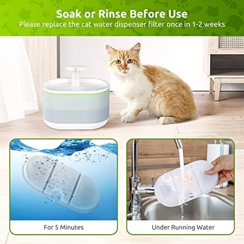 💦【FRIENDLY REMINDER】: Please soak the filter in water for 5 minutes before use and rinse thoroughly under running water. Replace the cat water dispenser filter once in 1-2 weeks in summer and once in 2-4 weeks in winter to ensure clean drinking water. More frequent changes if more than one pet is using the water fountain;