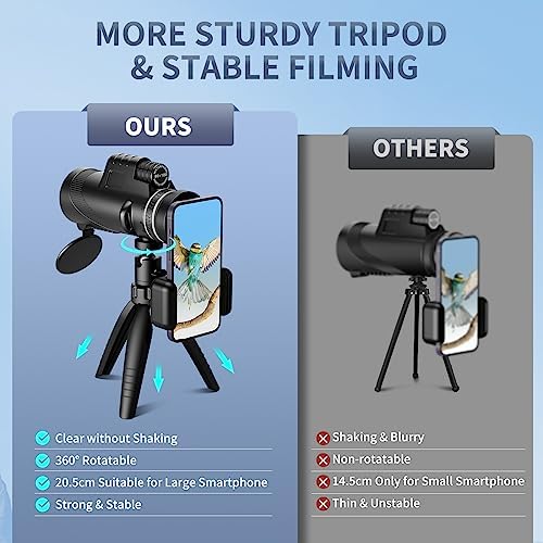 【Compatible with Smartphones】This monocular is compatible with almost all phones and is very easy to use. Point the main camera of your phone at the eyepiece of the telescope, and zoom phone screen to get a full-screen photo and video. You can also share your photos with friends and family, allowing everyone to enjoy those beautiful moments together.