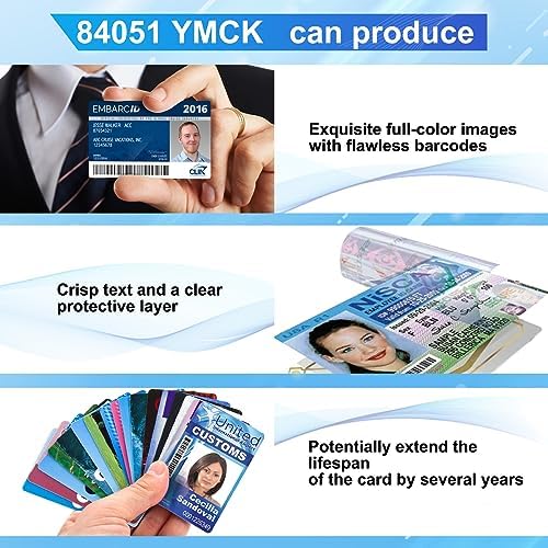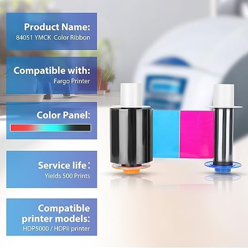 Excellent Quality : 84051 YMCK color ribbon replacement for fargo 84051 YMCK color ribbon is made of high quality materials imported from Japan, Germany and Italy. As a result, 84051 ribbons create vivid clarity and detail, and maintain the color of the product for a longer period of time due to the protective coating of the 84051 dye film.