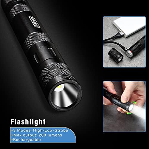 ABOUT FLASHLIGHT: Rechargeable; Uses 1×14250 lithium battery(included); 3 Modes: High-Low-Strobe; Max Output: 200 lumens. Operation: Twisting flashlight head to switch modes between High-Low-Strobe. How to recharge: Unscrew the flashlight head cap completely off->find the USB-C charging port on the base of the thread->Plug charging cable in. In normal charging, Indicator light turns on Red for charging and Green for battery full charged
