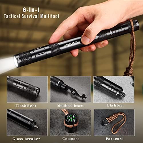AbeuRox 6-in-1 Multitool, Flashlight Multi-tool Kits with Rechargeable Flashlight, Lighter, Glass Breaker, Compass, Paracord, EDC Survival Gadget, Camping Gear, Cool Gifts for Men Women (Black)