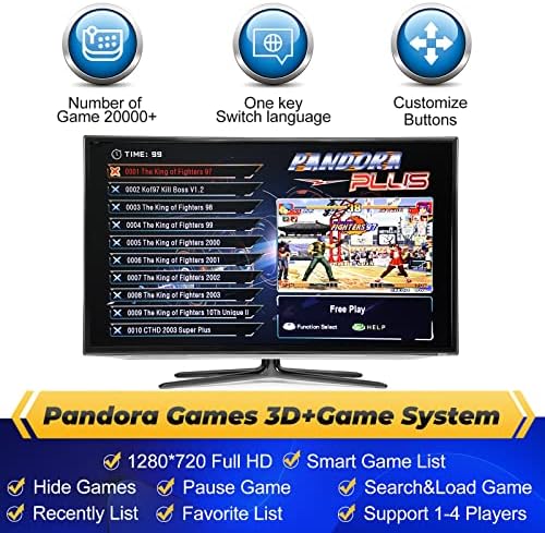 Pause Game The players can pause the game at any time Save Game Save the game being played at any time for convenient continuation next time Hide Game Hide any games in the list to prevent children from playing inappropriate games Search Game Players can quickly find the games they want to play through the search function Wide Compatibility TV/PC/Screen/Monitor/Projector/PS3, etc Language Mode Select the language according to the actual situation, including Chinese, English, Japanese, Korean, and other languages Power consumption 20W Power and 12V Voltage, Low power consumption make our console safe and reliable. Customizable Buttons Players can customize the position of the buttons according to their own operating habits, which allows players to have a better gaming experience Favorite List Players can collect their favorite games and have their own list of preferences