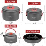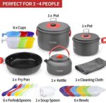 FAMILY CAMPING COOKING SET FOR 3-4 PEOPLE — This camping pots and pans set includes 1 x 2.2L pot, 1 x 1.4L Pot, 1 x 7.5″ frying pan, 1 x 0.8L kettle, 6 x cups, 6 x soup bowls, 6 x forks, 1 x collapsible spoon, 1 x cleaning cloth,1 x carry bag. You can enjoy delicious food with your lover anywhere, a great choice for camping, picnic or any other activity;