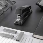 Full-strip desk stapler holds up to 200 staples; low-staple indicator shows when it’s time to refill