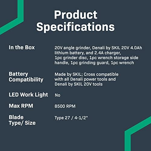 Includes a 20V small 4-1/2-inch cordless angle grinder, Denali by SKIL 20 4.0Ah battery, 2.4A charger that fully charges a 2.0Ah battery in 60 minutes and a 4.0Ah battery in 100 minutes, grinding disc, grinding guard, wrench, and wrench-storage side handle