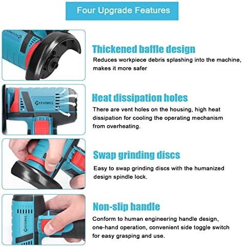 【Upgrade】1- Cordless design, powered by lithium battery, you can charge it anytime. 2- The housing has vent holes for high heat dissipation to cool the operating mechanism from overheating. 3- The thickened baffle design reduces splashes of workpiece debris into the machine, making the operation process safer and effectively extending the lifespan of the machine.
