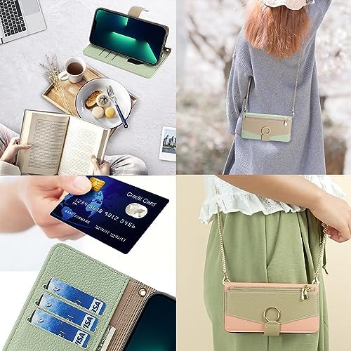 Arseaiy Wallet Case for Oppo A38 4G/Oppo A18 4G Flip Phone Case Cover with Crossbody Strap Magnetic Zipper Pocket Makeup Mirror PU Leather Shockproof with Kickstand Shell Green