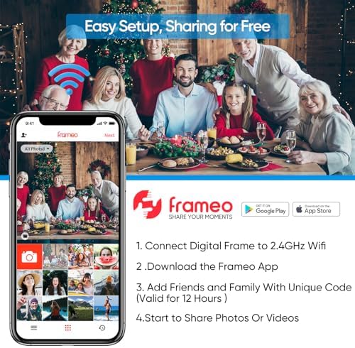 【Instant Sharing with FRAMEO App】Connect the electronic picture frames to WiFi, download the free FRAMEO app on your phone. Easily share photos and videos (up to 15seconds) with friends and family through APP, no matter where they are in the world. Note: Don’t transfer more than 10 pics at a time.