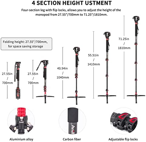 ☑Carbon Fiber leg in 4 sections with flip locks enable fast and fumble-free set-up. Extend to 71.25 inches.using a supplied Y-style key, the user can tighten the screw on each spring-loaded flip lock to safeguard their continued reliable performance