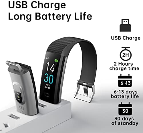 【USB Charge&Long Battery Life】- Enjoy 6-13 days of battery life with 2 hours charging time via built-in USB,and standby up to more than 30 days.The fitness watch can be charged directly on any computer or USB charger, no adapter or charging cable required.