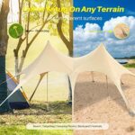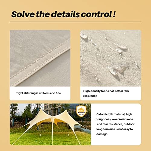 AN ANEWSIR Beach Tent Canopy, New Desgin, 9ft Tall, 13 x 20 ft diameter, 2x 9ft aluminum poles and 1x 6.5ft alumium pole for selective use,8 large sandbags, 8x anchors, only 12 pounds with carrying bag. Made of Lycra water-resistant fabric with UPF 50+ protection, it can block 98% of harsh sunlight and reduce sunburn or glare.
