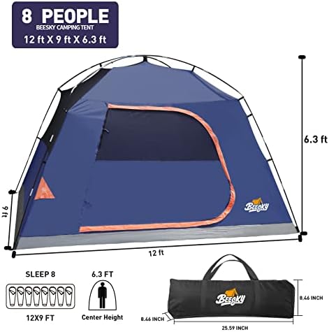 Beesky Waterproof Camping Tents 6/8 Person Windproof Easy Set Up Large Family Dome Tent with Removable Top Rain-Fly Large Mesh Windows Portable Carry Bag