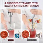 Unmatched Performance and Quality: Elevate Your Culinary Creations. Our stick blender features a high-precision 800W pure copper motor, balanced for enduring durability. With its innovative 4-prong titanium blade rotation system, it effortlessly crushes, pulverizes, and blends ingredients, surpassing the abilities of other models. Unlock a world of exciting flavors that rival gourmet experiences found in stores and restaurants.