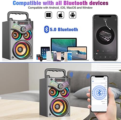 Portable Bluetooth speaker with built-in Bluetooth 5.0 wireless transmission and working distance up to 100 feetCompatible with all Bluetooth devices, such as smartphones, tabletsCan be paired with personal computers, MP3, MP4, and cell phones with 3.5mm stereo audio output interface and other audio devicesSupport EQ one key to switch the scene mode (indoor and outdoor)Support TF/SD card music playbackSupport U disk music playbackSupport AUX line input connection (3.5MM)Support FM radio, FM channel automatic or manual control (please refer to the manual for detailed operation)Support digital display + intelligent remote controlSupport microphone connection (3.5MM)Automatic memory track number after shutdown