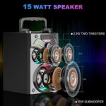 This compact party speaker has a compact size of 4.7*6.5*8.25in, it has 3 speakers, 10W woofer double 2.5W tweeter and a rear heavy bass guide tube. With this Bluetooth speaker, you’ll experience really deep bass and true HD sound that it will bring you an unprecedented listening experience.
