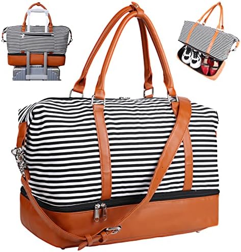 【MULTI-PURPOSE】The canvas duffel bag can be used as kids travel bag, beach bag, hospital bags for labor and delivery for women, gym bag and baby bag. The carrying tote bag is also approved as carryon bag and personal item of easyjet and other majority airplanes. The folding carry-on luggage is lightweight but large-capacity. The shoe compartment of the womens weekender bag is separated from the main compartment. You are relieved to carry on 2 adult shoes or dirty clothes for overnight traveling.