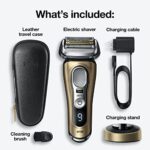 WHATS IN THE BOX: Series 9 Pro electric razor, charging stand, leather travel case, cleaning brush, charging cord, and user manual.