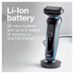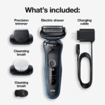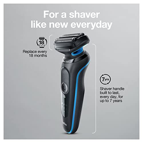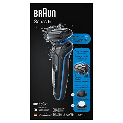 Braun Series 5 electric shaver for men makes shaving easy with 3 Flexible Blades that adapt to your facial contours. The EasyClean system delivers a fast and easy cleaning without removing the shaver head. The Li-Ion Battery provides up to 3 weeks of shaving and a 5 min quick charge. This men’s electric razor is 100% waterproof for Wet & Dry use. Compatible with EasyClick system. Facial Cleansing Brush attachment included.Box includes:1x Series 5 Electric razor for men – Blue1x Cleansing Brush attachment1x Precision Trimmer attachment1x Protective Cap1x Smart plug for automatic 100-240 voltage adjustment1x Cleaning Brush