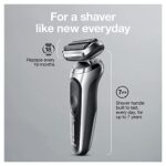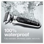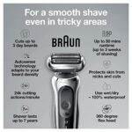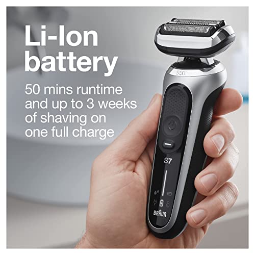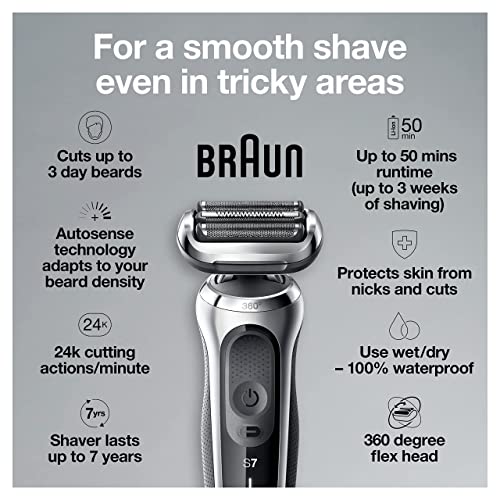 Braun Series 7 electric shaver for men with 360 Degree adaptation for a smooth shave. Features autosense technology that reads and adapts to your beard density, removing more hairs in every stroke. The Li-ion battery provides up to 3 weeks of shaving and a 5 min quick charge. This men’s electric razor is 100% waterproof for wet & Dry use. Compatible with easy click system. Precision Trimmer attachment included. Box includes 1x series 7 electric razor for men – Silver 1x precision Trimmer attachment 1x Travel case 1x smart plug for Automatic 100-240 voltage adjustment 1x cleaning brush