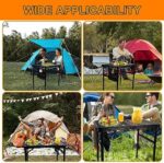 【2 Adjustable Heights】The folding camping table provides 2 adjustable heights to accommodate your preferences. You can quickly and easily install the sturdy telescopic table legs to raise the height of the folding picnic table from 10.7 inches in the first height option to the 22.3 inches in the second height option.ed stability compared to ordinary iron tubes. Each side features a triangular support structure and 4 latches, ensuring the table stays steady.