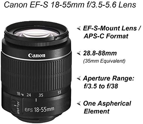 Canon EF-S 18-55mm F/3.5-5.6 Zoom Lens – EF-S-Mount Lens/APS-C Format, 28.8-88mm (35mm Equivalent), Aperture Range: f/3.5 to f/38, One Aspherical Element, Super Spectra Coating , Micro Motor AF System, Rounded 6-Blade Diaphragm.