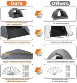 Unique Floormat and Sunshelter Design: The extended 24.4in floor mat design can put your camping gears and keep them dry even on rainy days. The vestibule and awning-type door on the front increased 40% more space than traditional tent, you can support it with poles as a sunshade or roll it up according to your needs, suitable for various occasions.