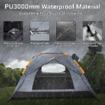 Waterproof & Windproof Everywhere: The inner and outer tent made of 190T polyester PU 3000mm special waterproof coating material, the bottom made of durable 210D PU 5000mm oxford material, the sealed seams and the unique waterproof strip make this a high-quality water-resistant tent. Sturdy fiberglass poles can withstand 30+ mph winds. The unique three-layer structure ensures the tent stable and keep the inner dry in any weather.