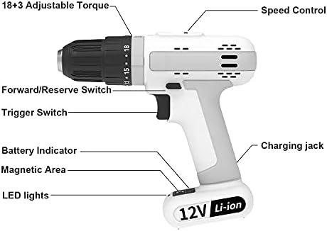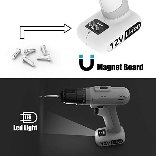 Lightweight & Comfortable: Our power drill features an ergonomic handle with soft, anti-slip grip rubber, ensuring your comfort during use. It runs on a built-in 12V Li-ion battery and includes a magnetic holder for your bits and screws. The power display function keeps you informed—remember to charge when only one battery indicator light is on. Additionally, it boasts a built-in LED light that activates when you start drilling, making it a breeze to work in dimly lit spaces.