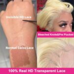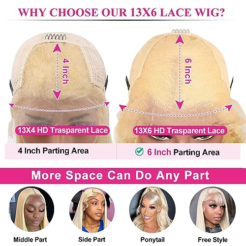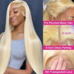 Blonde Human Hair Wig Details: 613 Lace front wig human hair 13×6 transparent lace,180% density HD lace front wigs human hair pre plucked with baby hair, full and thick. HD transparent lace suitable for most skins,6 inch deep parting can do free part, middle part or side part.