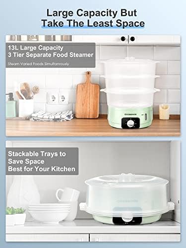 【Large Capacity But Take The Least Space】13.7QT large capacity electric steamer with 3 tier separate food steamer,it can steam varied foods simultanrously. But the stackable trays can save space, easy to store on countertop, cabinets or pantry, best for your kitchen.