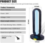 Mode UV+Ozon free Rated power 38W Voltage 110V Wavelength 254nm UV tube serving life 8000h Rated frequency 60hz Product weight 1.9lb Package includes 1 x Ultraviolet sterilization Lamp;1 x Remote Controller(battery included);1x Safety Glasses; 1 x Manual(English)