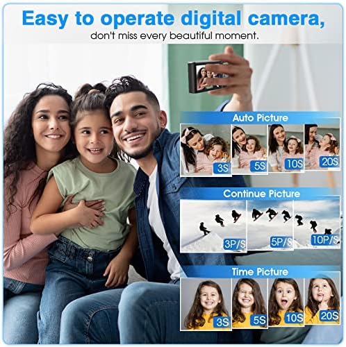【Multifunctional Digital Camera】This small digital camera can be connected to PC and used as a webcam for video calls and live streaming. The time-lapse photography function helps you record the trajectory of the starry sky and the moment when the flowers bloom, and the slow-motion function helps you to capture the wonderful moment and play it back at a slow speed. The compact digital camera support 3 continuous shooting, 3s/5s/10s timing shooting, easy to take photos with friends in parties. Plus anti-shake, loop recording, flash, and more! More interesting functions are waiting for you to experience!