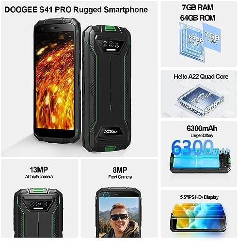 Home Electronics Smartphone DOOGEE S41 PRO Rugged Smartphone Unlocked,6300mAh Battery,7GB+64GB,4G Dual Sim Rugged Phone,Android 12 Phone,13MP Camera,IP68 Waterproof Cell Phone,Face Unlock,NFC/T-Mobile,Green