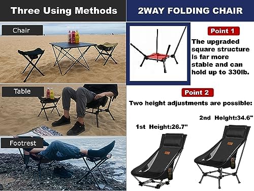 Practical: Snug seat and headrest ensure support and relaxing comfort for hours. Also included are three pockets: one back magazine pocket, one zippered pocket and one drink holder. Two adjustable height levels for greater stability on uneven terrain or just to fit your desired height.
