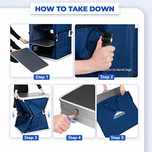 EXCELLENT QUALITY: Eagle Peak camping kitchen table is made of durable MDF tabletop, waterproof and stain resistant material, and is easy to clean. The frame is made of anti-rust powder-coated aluminum pipe and polyester 600D with PVC coating. The aluminum alloy bracket with corner leg support system ensures the strong stability for long lasting use. This table supports up to 66 lbs.